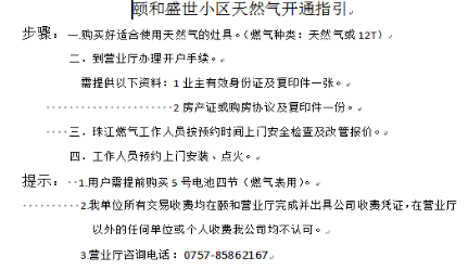 珠 江頤和小區營業廳就設置與供氣小區內,有關辦事指南已在營業廳內公示。 |