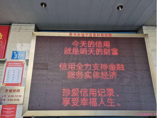 2021年2月新華街在福寧社區開展信用宣傳活動,此次活動針對社區、學校、村鎮等重點宣傳,通過政務中心、學校、社區、街道、樓宇等公共場所播放由市信用辦制作的信用宣傳視頻及電子海報,共播放視頻20余次,電子海報100余次。倡導企業和街坊樹立“誠信為本、操守為重”的觀念,積極引導大家在日常生活中講誠信、重信用,做一名“愛國、守法、誠信、文明”的公民,營造誠實守信的良好社會風尚,推進誠信建設規范化、長效化,營造誠實守信的良好社會環境。