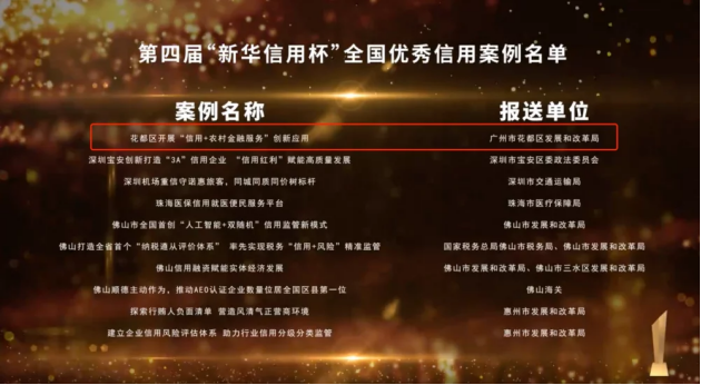 1月4日,第四屆中國城市信用建設高峰論壇在北京和廣州兩地聯動舉辦。現場公布了第四屆“新華信用杯”全國優秀信用案例和信用應用場景優秀微視頻評選結果。“花都區開展‘信用+農村金融服務’創新應用”案例成功獲評為全國優秀信用案例。