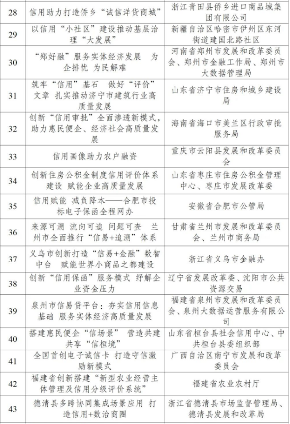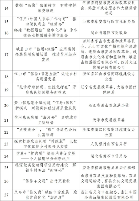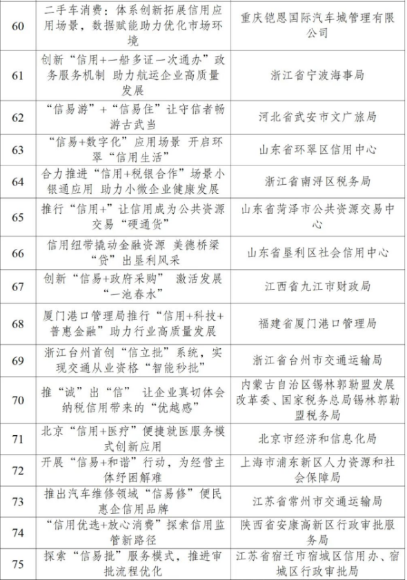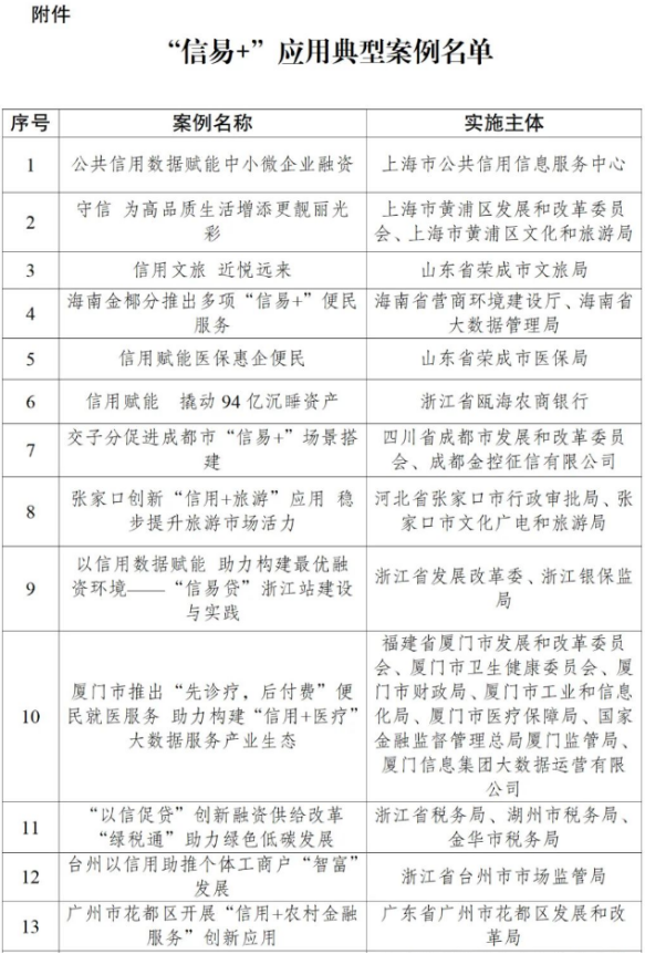 現(xiàn)向社會公開發(fā)布評選出的80個“信易+”應(yīng)用典型案例名單,具體案例內(nèi)容后續(xù)將進(jìn)行展播,供各地方學(xué)習(xí)借鑒,復(fù)制推廣典型做法和成功經(jīng)驗,引導(dǎo)經(jīng)營主體樹立誠信興商經(jīng)營理念,助力形成全社會“知信、守信、用信”的大格局,為構(gòu)建新發(fā)展格局、推動經(jīng)濟(jì)社會高質(zhì)量發(fā)展貢獻(xiàn)力量。