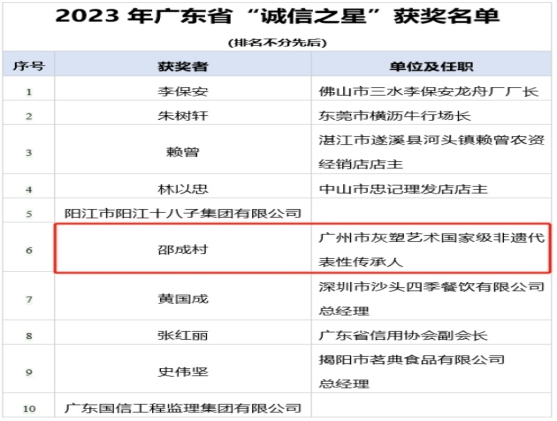 12月26日中共廣東省委宣傳部、廣東省發(fā)展改革委舉行2023年廣東省“誠(chéng)信之星”發(fā)布儀式。2023年廣東省十大“誠(chéng)信之星”名單正式揭曉。來(lái)自廣州市花都區(qū)的灰塑藝術(shù)國(guó)家級(jí)非遺代表性傳承人邵成村入選。