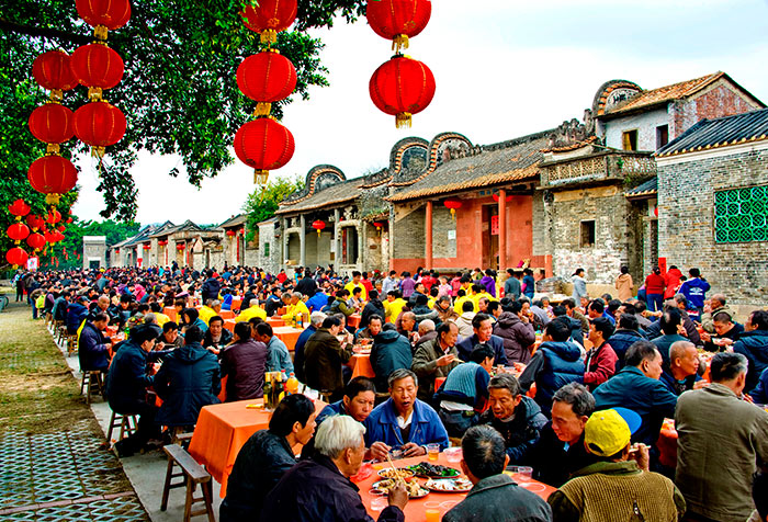 People in the Time-honored Village Langtou are celebrating the New Year, with red Lanterns raised everywhere.