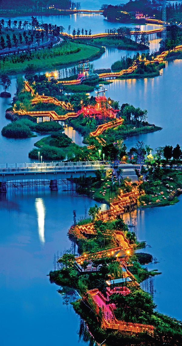 花都湖とは東側で鉄山河の河口から起點し、西側で京広鉄道橋まで至り、全長は約6.68 キロメートル、敷地総面積は約2.8 平方キロメートルになっている。花都湖公園は設計上で充分的に親水性を體現し、歴史特色風貌の保留に取り組んでおり,現地文化元素を融合している。この開発建設は強く周辺約23 平方キロメートルの南部新城區の発展を連動し、これによって花都主要都市と広州センター都市の接続チャンネルを繋ぎ、広州「北優」戦略のプロセスを促進している。