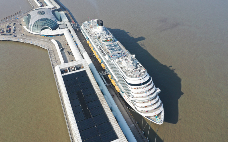 2024年1月1日,“愛達·魔都號”停靠在上海吳淞口國際郵輪港(無人機照片)。