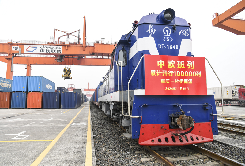 2024年11月15日,第10萬列中歐班列——X8083次中歐班列(重慶—杜伊斯堡)在重慶團結村中心站準備發車。