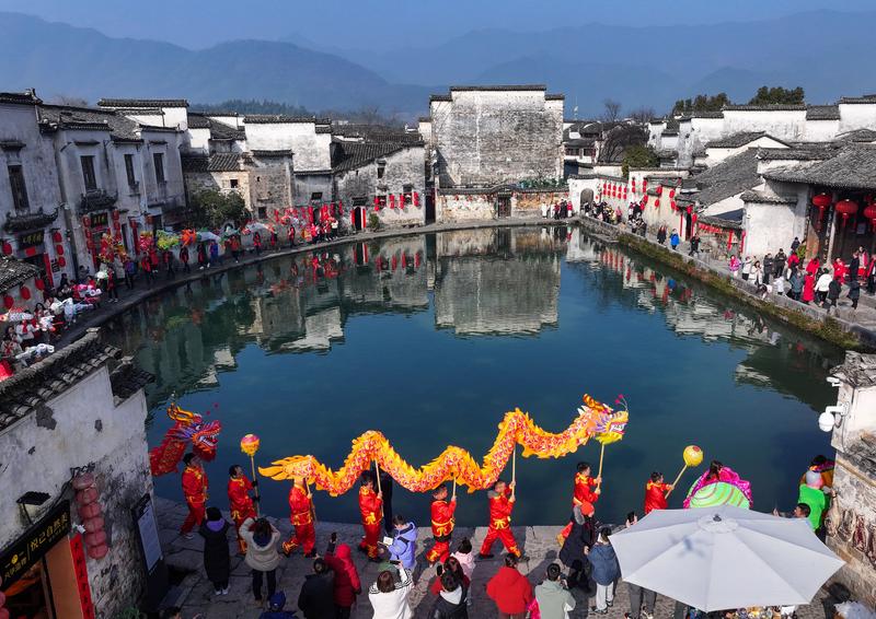 民俗舞龍表演隊伍在安徽省黃山市黟縣宏村巡游(2025年2月10日攝,無人機照片)。新華社發