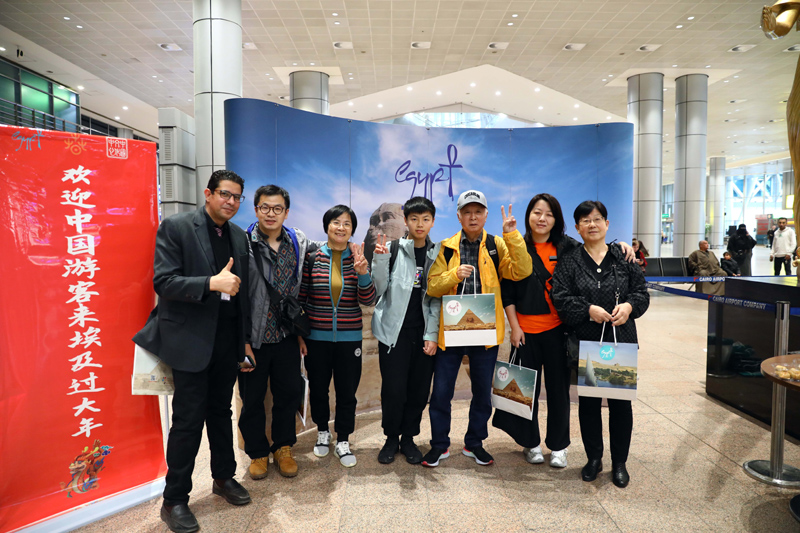2024年2月10日,中國游客在埃及開羅國際機場舉行的“歡迎中國游客來埃及過大年”儀式上合影留念。新華社發