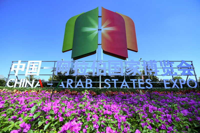 這是2023年9月21日在寧夏銀川拍攝的第六屆中國—阿拉伯國家博覽會開幕式會場外景。