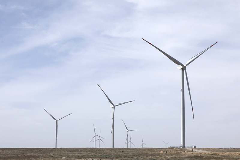 這是2023年4月3日在哈薩克斯坦札納塔斯拍攝的札納塔斯100兆瓦風電項目風機。