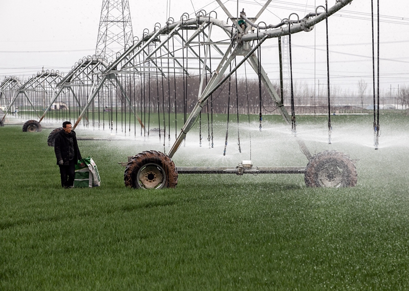 2024年3月18日,在河南省焦作市博愛縣孝敬鎮東原莊村瑞輝家庭農場,村民使用全自動指針式噴灌機進行澆灌作業。