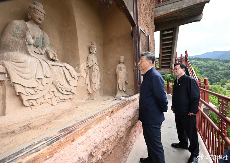 10日下午至11日上午,習近平總書記先后來到陜西省寶雞市和甘肅省天水市考察調研。在寶雞市,習近平考察了寶雞青銅器博物院、渭河生態公園,了解當地加強文物保護利用和開展渭河生態保護治理等情況。在天水市,習近平考察了伏羲廟、麥積區南山花牛蘋果基地、麥積山石窟,了解當地推動文化遺產保護傳承、發展特色現代山地果業等情況。