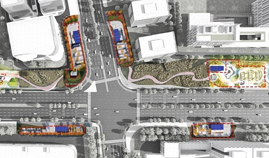 與此同時,空間整合,優化土地資源配置。充分考量交通接駁需求,通過返征退縮用地,拓展停車空間,并采用綠化帶分隔,兼顧美觀與秩序,車站共設非機動車停車位1008個。同時強化需求傳導,結合公交、出租車及K+R停靠需求,對現有鳳凰南路、永利路提出增設港灣式公交車站、臨時停泊車位等接駁空間改造建議,提高換乘效率。