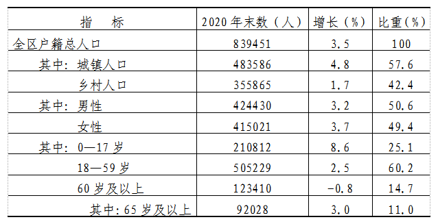2020年末,全區戶籍人口83.95萬人,比上年增長3.5%,其中,城鎮戶籍人口48.36萬人,鄉村戶籍人口35.59萬人;男女性別比(以女性為100)為102.3,家庭戶均人數3.04人。全年出生人口11554人,出生率14.24‰;死亡人口4140人,死亡率5.10‰;自然增長人口7414人,人口自然增長率9.14‰。