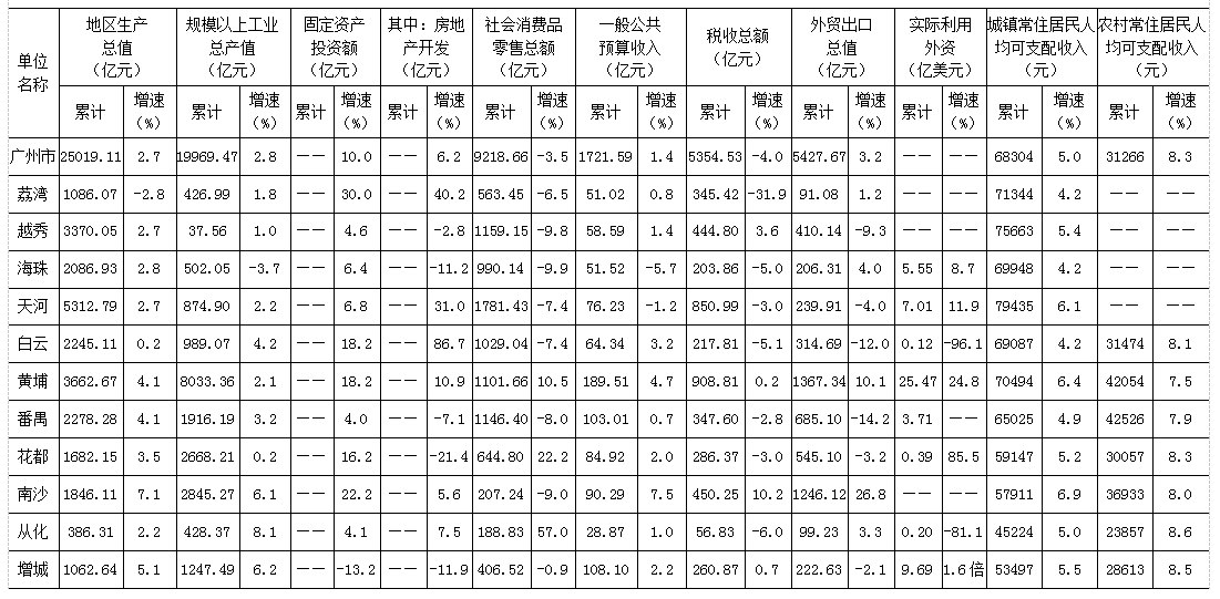 注:1、2020年數據為初步統計數; 2、從2018年起,市統計局只反饋固定資產投資(項目在地)增速,下同; 3、2016-2020年一般公共預算收入(支出)數據為財政總決算數據。 2020年1-12月廣州市各區主要經濟指標對比表
