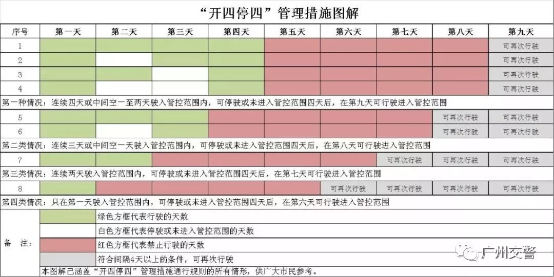 非廣州市籍中小客車(含臨時號牌車輛)駛入管控區域連續行駛時間最長不得超過4天(自然日,下同),再次駛入須間隔4天以上,簡稱“開四停四”管理措施。