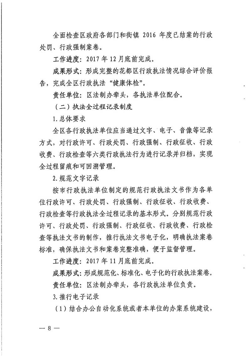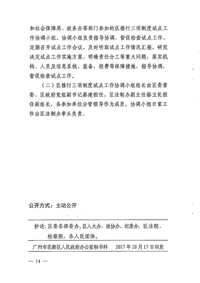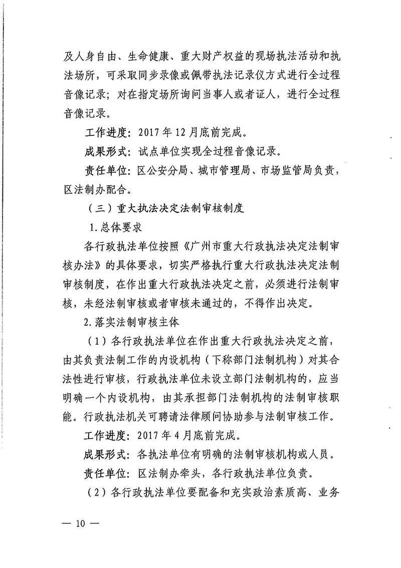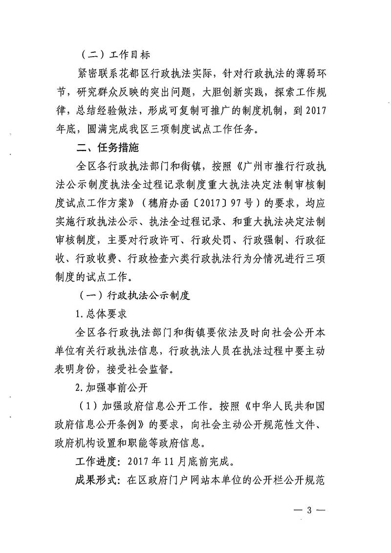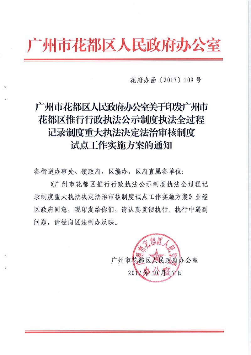 廣州市花都區人民政府辦公室關于印發廣州市花都區推行行政執法公示制度執法全過程記錄制度重大執法決定法治審核制度試點工作實施方案的通知【花府辦函〔2017〕109號】