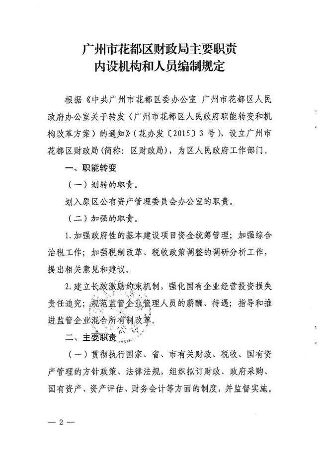 廣州市花都區(qū)人民政府辦公室關于印發(fā)廣州市花都區(qū)財政局主要職責內設機構和人員編制規(guī)定的通知【花府辦[2016]3號】