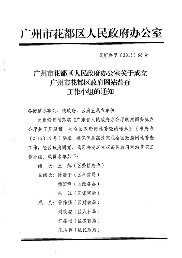 廣州市花都區(qū)人民政府辦公室關于成立廣州市花都區(qū)政府網(wǎng)站普查工作小組的通知【花府辦函[2015]66號】