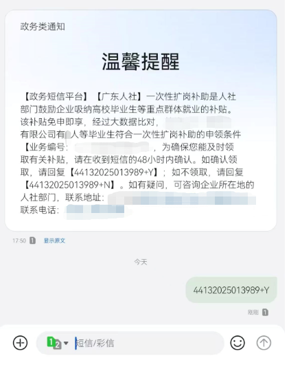 按照《人力資源社會保障部辦公廳關于做好一次性擴崗補助經辦工作的通知》和《轉發關于做好高校畢業生等青年就業創業工作的通知》(粵人社發〔2024〕19號)等國家、省文件規定,對在2024年1月1日至2025年12月31日期間招用畢業年度及離校兩年內未就業的高校畢業生或16-24歲登記失業青年,與其簽訂勞動合同,并按規定為其足額繳納3個月以上的失業、工傷、職工養老保險費的企業,按每招用1人1000元的標準給予一次性擴崗補助,政策執行至2025年12月31日。一次性擴崗補助原則上“免申即享”,政務短信平臺推送信息給符合申請資格的企業,企業確認后由公共就業服務機構按規定在省集中系統對企業信息齊全的數據進行審核。如企業未在規定時限內答復確認短信息或開戶銀行信息及賬號缺失,將導致無法繼續審核,即視為放棄該項補貼。
