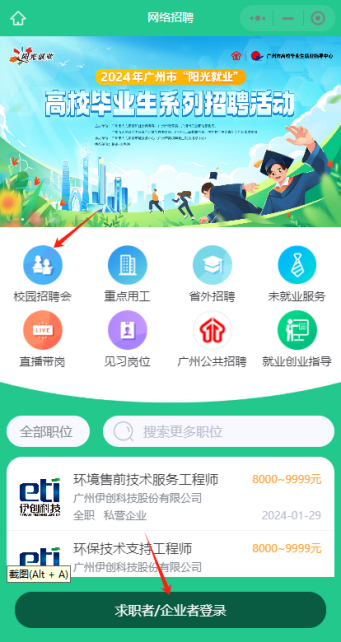 ?。?)“陽光就業”小程序(操作步驟:進入小程序—點擊求職者/企業登錄—查詢職位、參加校園招聘會等)。