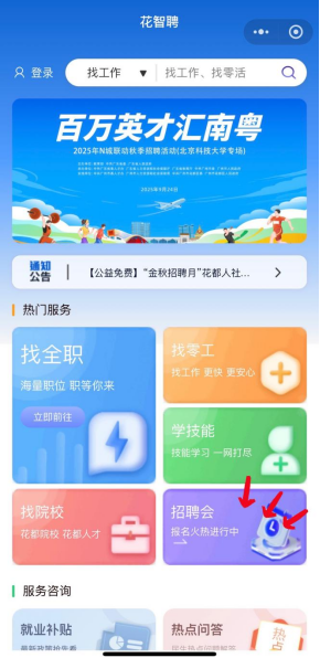 花都人才微信公眾號(操作步驟:進入公眾號—求職模塊下的“免費求職”—免費注冊、查詢職位、招聘會信息等)。