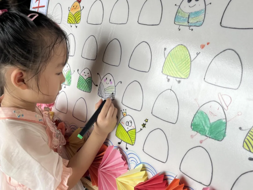 一到現場,孩子們就在簽到墻上手繪創意粽子,以獨特的方式簽到,畫出的粽子各有神態,有的唱歌、有的跳舞、有的玩?!磉_孩子們過端午節及參加活動愉悅的心情。