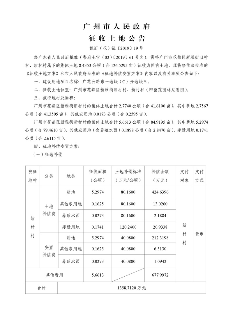 廣州市人民政府征收土地公告--穗府(花)征〔2019〕19號