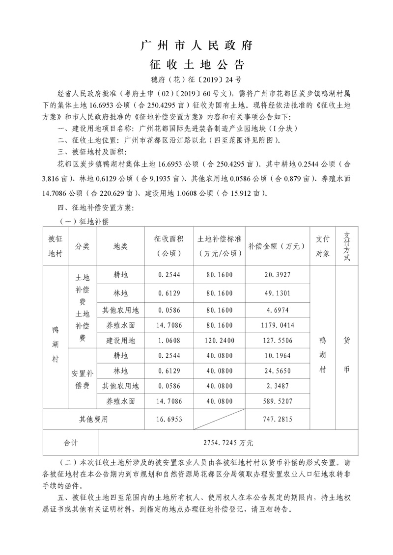 廣州市人民政府征收土地公告--穗府(花)征〔2019〕24號