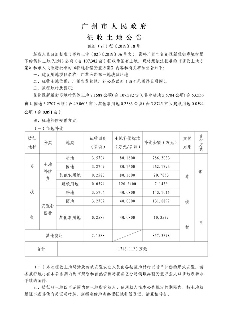廣州市人民政府征收土地公告--穗府(花)征〔2019〕18號