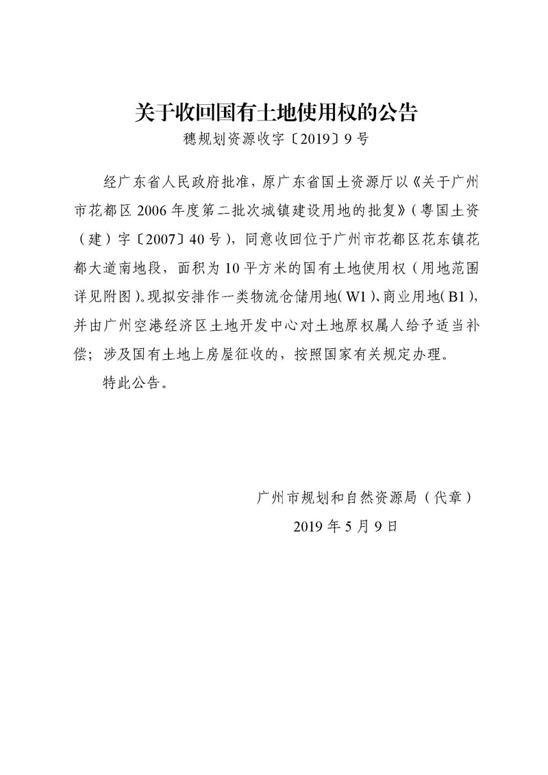 收回國有土地使用權的公告(穗規劃資源收字〔2019〕9號)