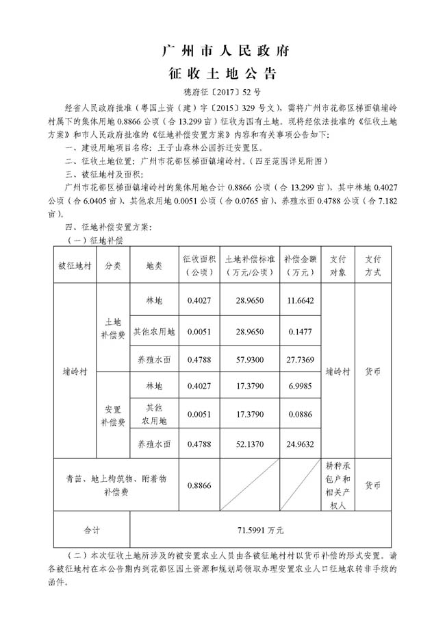 廣州市人民政府征收土地公告——穗府征〔2017〕52號