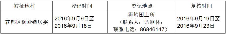 經省人民政府批準(粵國土資(建)字[2016]251號文),需將廣州市花都區獅嶺鎮居委屬下的集體土地0.3376公頃(合5.0640畝)征收為國有土地。現將經依法批準的《征收土地方案》和市人民政府批準的《征地補償安置方案》內容和有關事項公告如下: