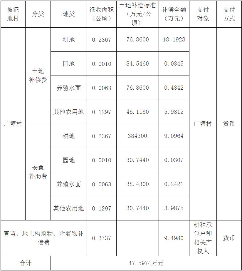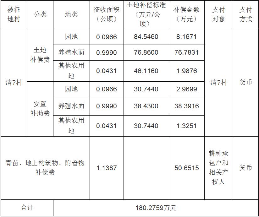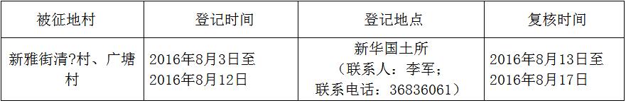 經(jīng)省人民政府批準(zhǔn)(粵國土資(建)字〔2015〕1013號文),需將廣州市花都區(qū)新雅街清?村、廣塘村屬下的集體土地1.5124公頃(合22.686畝)征收為國有土地。現(xiàn)將經(jīng)依法批準(zhǔn)的《征收土地方案》和市人民政府批準(zhǔn)的《征地補償安置方案》內(nèi)容以及有關(guān)事項公告如下:
