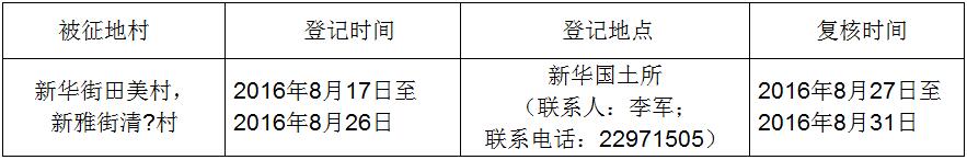 經省人民政府批準(粵國土資(建)字〔2016〕241號文),需將廣州市花都區新華街田美村,新雅街清?村屬下的集體土地2.3035公頃(合34.5525畝)征收為國有土地。現將經依法批準的《征收土地方案》和市人民政府批準的《征地補償安置方案》內容以及有關事項公告如下: