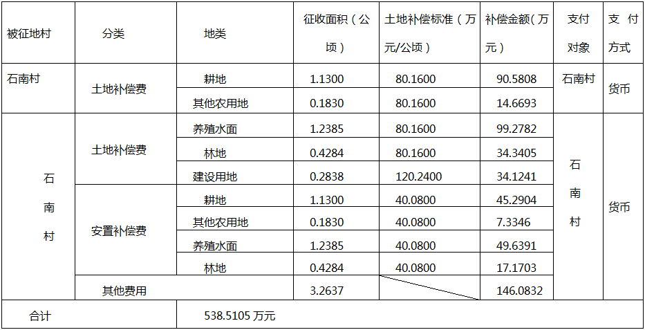 花都區炭步鎮石南村集體土地合計3.2637公頃(合48.9555畝),其中農用地2.9799公頃(耕地1.1300公頃、林地0.4284公頃、養殖水面1.2385、其他農用地0.1830公頃),建設用地0.2838公頃;