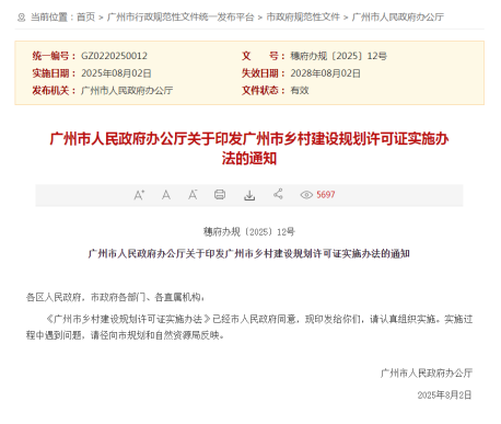 2025年8月2日,《廣州市鄉(xiāng)村建設(shè)規(guī)劃許可證實施辦法》(穗府辦規(guī)〔2025〕12號)正式印發(fā)實施,為全市鄉(xiāng)村建設(shè)規(guī)劃管理提供了清晰的制度依據(jù)和操作指引。該辦法聚焦于全市七區(qū)村莊規(guī)劃確定的集體建設(shè)用地范圍內(nèi)的村民住宅建設(shè),明確堅持“先規(guī)劃、后許可、再建設(shè)”的原則,倡導(dǎo)節(jié)約集約用地、嚴(yán)守耕地保護紅線,并進一步優(yōu)化審批流程,提升政務(wù)服務(wù)的便民性和透明度。